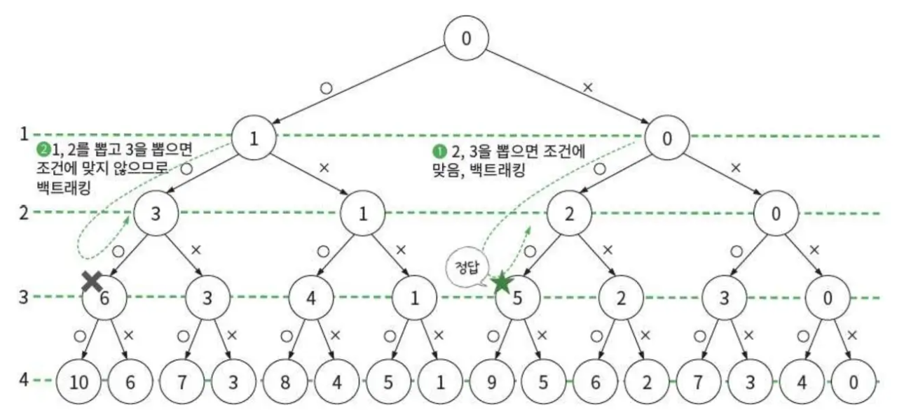 ex) {1,2,3} 뽑은 숫자 조합의 합은 6 다음 숫자가 4이므로 이미 목표 값(5)가 넘었으므로 더이상 유망하지 않다고 판단.
