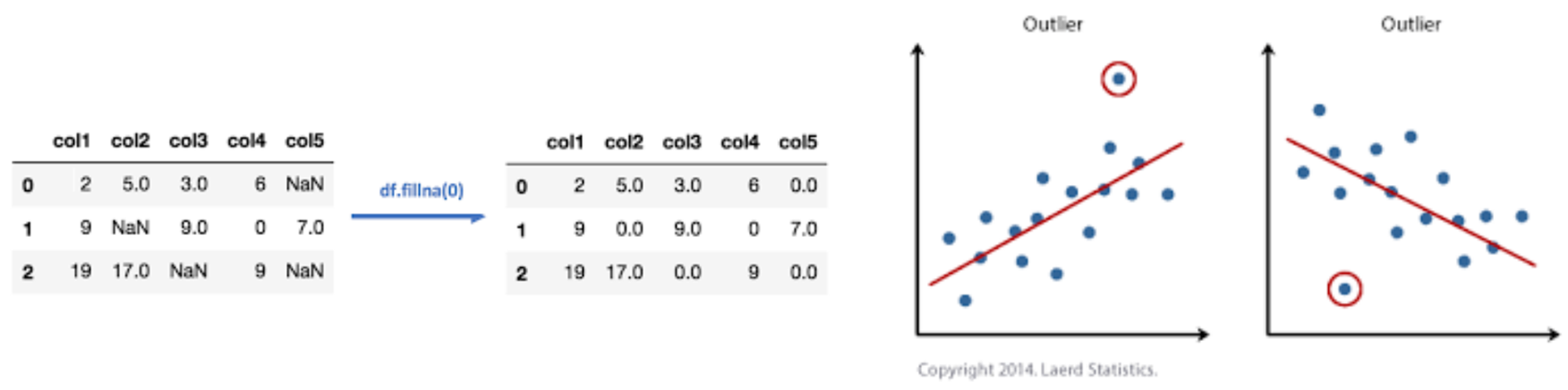 - 결측치 처리 - 평균, 중앙값 대체/ 최빈값, 0 값으로 대체 / 근처값 대체