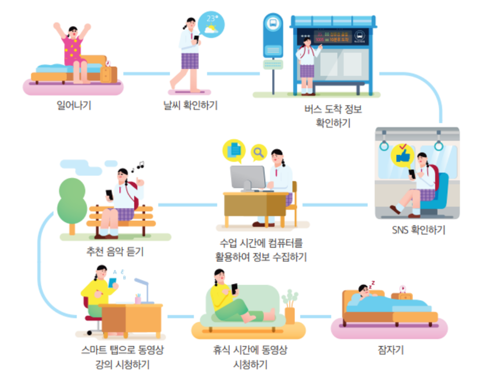 아침에 일어나서 날씨 데이터를 보거나, 등교 준비 시 교통 데이터를 확인하고, sns를 통해 정보를 얻고, 소통을 한다. 학교에서는 수업시간에 컴퓨터를 이용해 데이터를 얻고, 여가시간에 음악을 듣거나 태블릿 등으로 동영상 강의 시청도 가능하다.