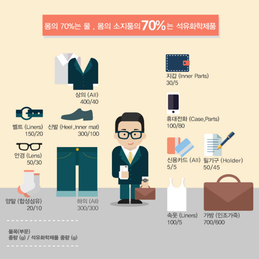 우리 몸의 70%는 물로 이루어져 있고, 몸의 소지품의 70%는 석유화학제품으로 이루어져 있다.