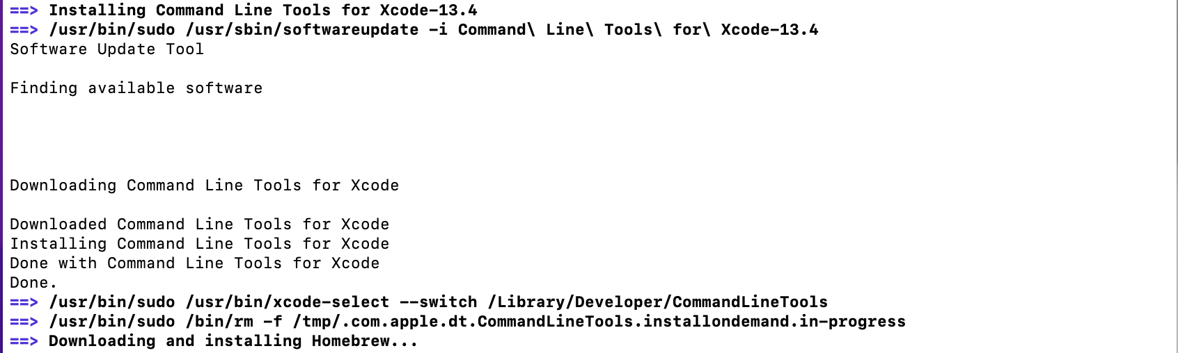 Xcode Command Line Tools 설치가 안 되어 있어서 Homebrew 설치하면서 같이 설치가 되었다.
