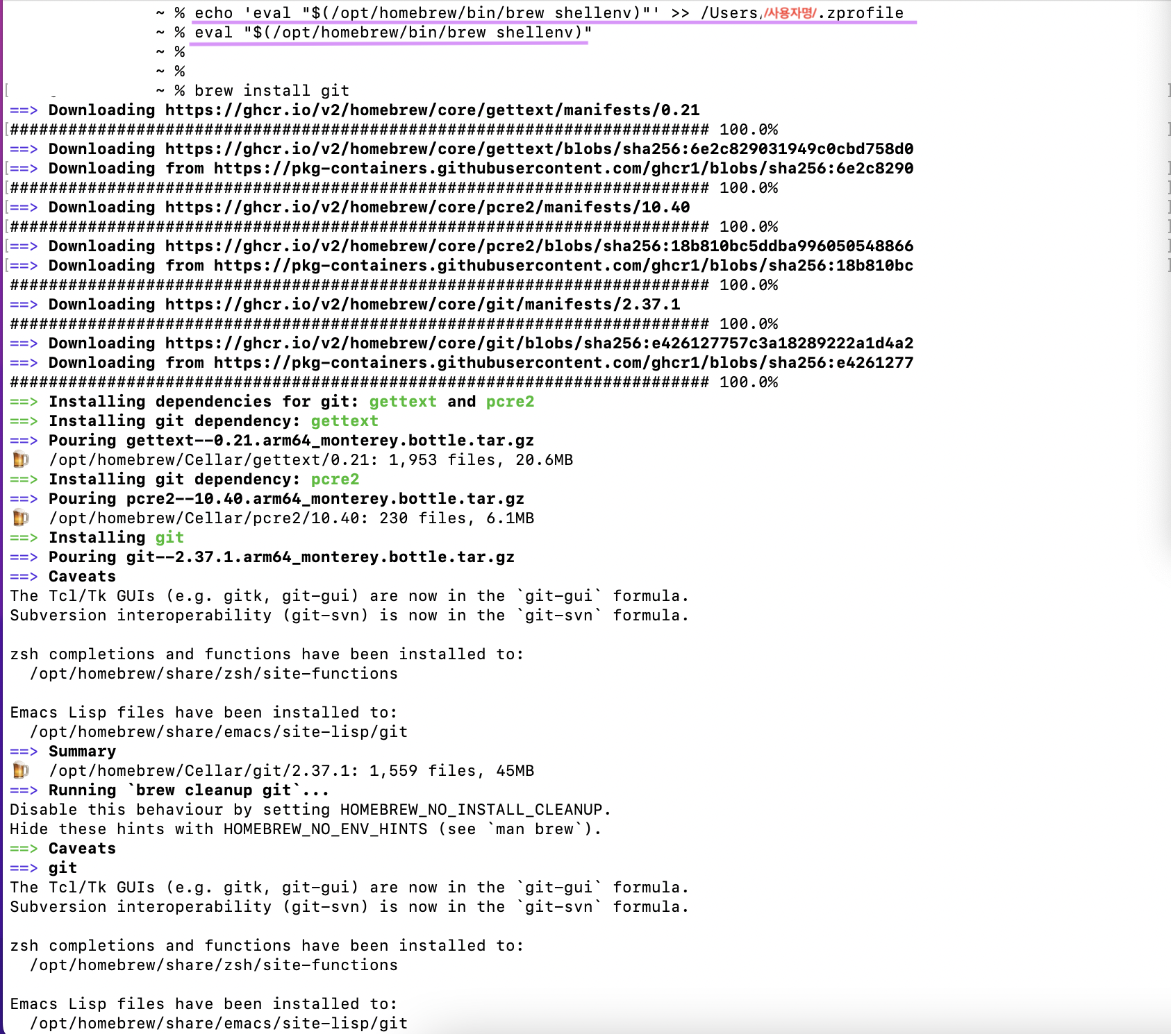 echo 'eval "$(/opt/homebrew/bin/brew shellenv)"' >> /Users/사용자명/.zprofile