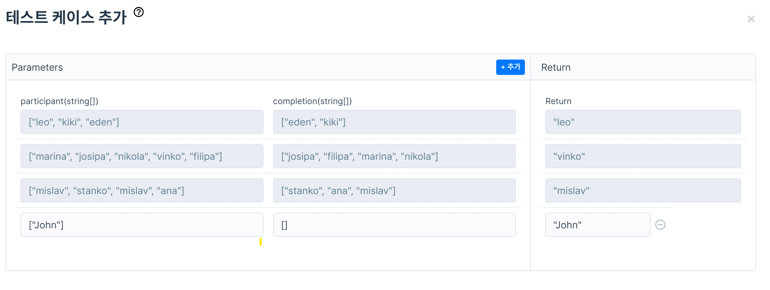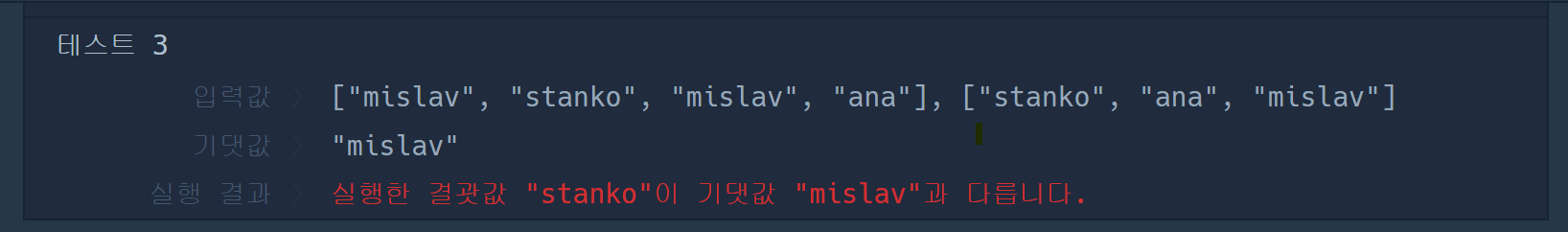 --> 완주자가 없는 경우 고려해야함. 밑의 사진처럼 테스트 케이스 추가해서 코드 실행해보기.