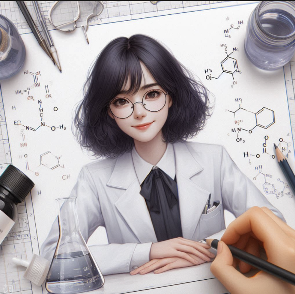 나는 화학과 대학생이야. 내가 과제 겸 실험을 하고있는 모습을 사실적으로 그려줘. 나는 검정색 중단발의 여성이야.