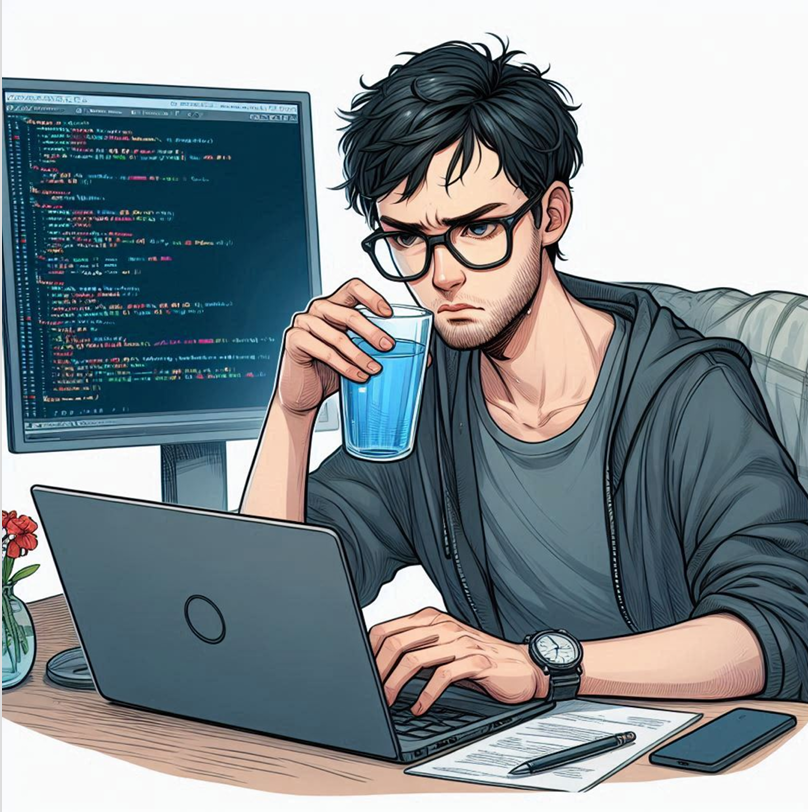 소프트웨어학과 대학생이고 프로그래밍하고있는 모습을 사실적으로 그려줘. 나는 짧은 검은 머리에 안경을 쓰고 남자야, 아주좋은 노트북을 쓰고있고 밤새 코딩을해서 피곤해보이는 모습도 추가해줘 옆에 따뜻한 물도 한잔 놔주고