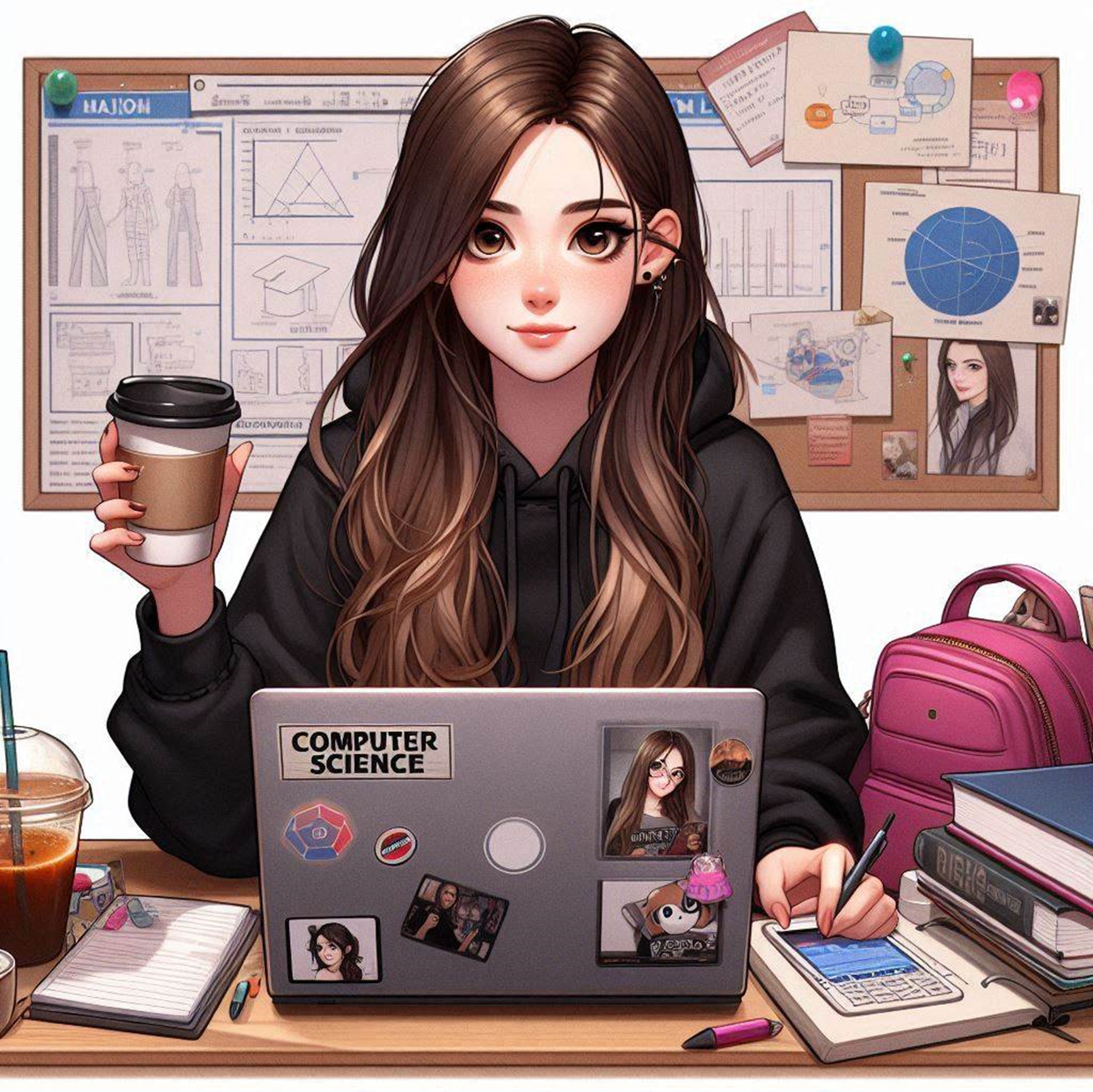 나는 컴퓨터공학과 대학생이야. 내가 전공 수업을 듣는 모습을 사실적으로 그려줘. 나는 검정색 긴머리의 여성이며, 노트북을 사용하고 커피를 먹고 있는 모습도 추가해줘.