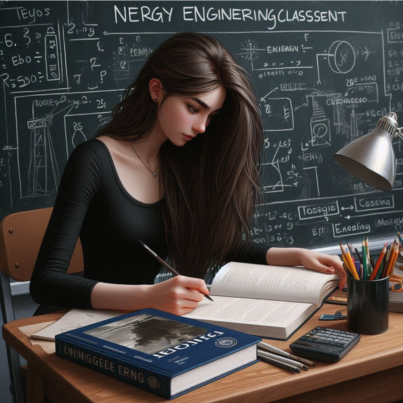 나는 환경에너지공학과 대학생이야. 내가 전공 수업을 듣는 모습을 사실적으로 그려줘. 나는 검정색 긴머리의 여성이며, 환경에 대해 공부를 하고 있는 모습을 그려줘.