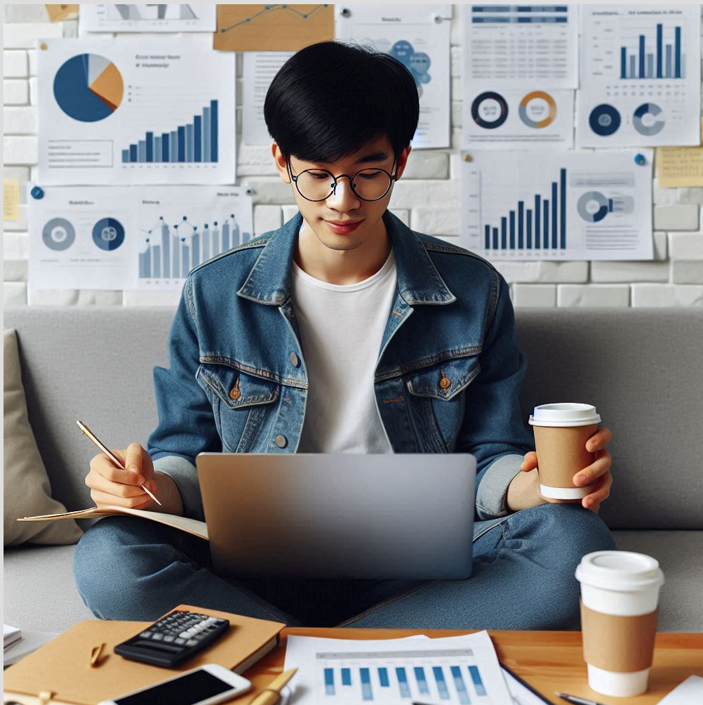 나는 경영학과 대학생이야. 내가 경영 분석을 하는 모습을 사실적으로 그려줘. 나는 검정색 머리의 남성이며, 안경을 쓰고